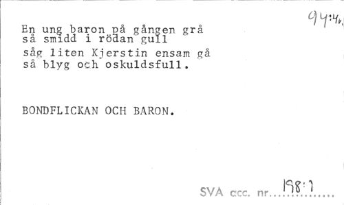 //// En ung baron nå gången grå så smidd i röäan gull //// såg liten Kierstin ensam gå så blyg och oskuldsfull. //// BONDFLICKAN OCH BARON. //// SVA ccc. nr.././... ////