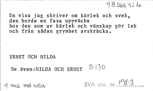 //// V&äb&l' I* //// En visa jag skriver om kärlek och svek, den borde en fasa uppväcka hos den som av kärlek och vänskap gör lek och från sådan grymhet avskräcka. //// ERNST OCH HILDA Se även:HILDA OCH ERNST //// *) wel-iwfoH/ SVA ccc- nr..!f)L?... ////