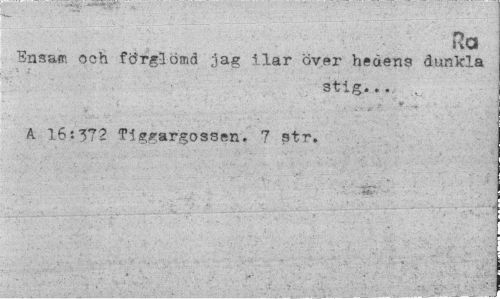 //// Vxo //// Ensam och förglömd Jag ilar över hedens dunkla //// stig... //// k 16:372 Tiggargossen. 7 str. ////
