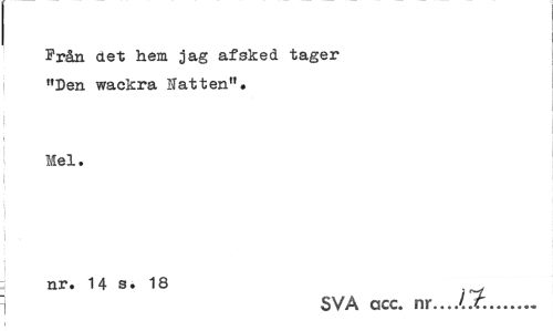 //// Från det hem jag afsked tager "Den wackra Hatten". //// Mel. //// I //// nr. 1 4 s. 18 //// i SVA acc. nr. .../.?... ////