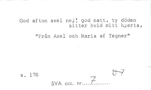 //// God afton axel nej! god natt, ty döden //// sitter hvid mitt hjerta, //// "Från Axel och Maria af Tegner" //// s. 178 tt"~7 SVA ccc. nr...C... ////