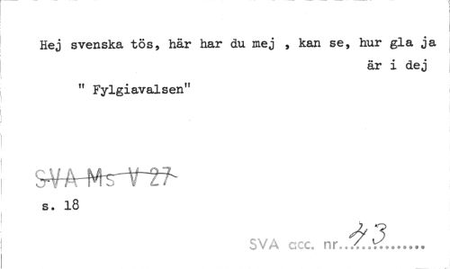 //// Hej svenska tös, här har du mej , kan se, hur gla ja //// är i dej //// " Fylgiavalsen" //// SWrMs-rth //// s. 18 //// SVA ccc. nr. 43. ////