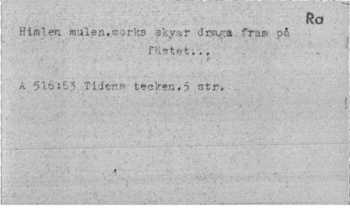 //// Ra //// Rimlen mulen,marks skyar draga fram pf; //// fästet.., //// A 516:53 Tiden» tecken.3 str. ////