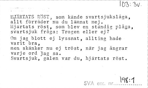 //// iay. oi //// HJÄRTATS RÖST, som kände svartsjukslåga, allt förråder nu du lämnat mej. Hjartats röst, som blev en ständig plåga, svartsjuk fråga: Trogen eller ej? //// Om jag blott ej lyssnat, allting hade varit bra, //// men skänker nu ej tröst, när jag ångrar varje ord jag sa. //// Svartsjuk, galen var du, hjärtats röst. //// !ci t-A //// SVA ccc. nr.. 1 ^i.1 ////