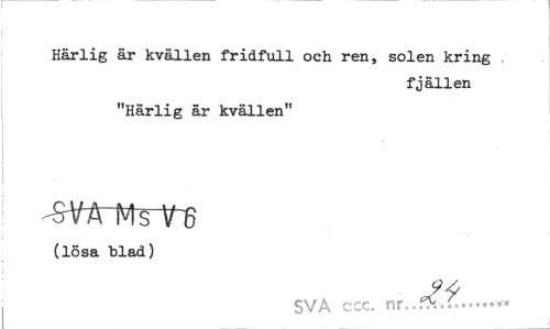 //// Härlig är kvällen fridfull och ren, solen kring . //// fjällen //// "Härlig är kvällen" //// -S-VA Ms V 6 //// (lösa blad) //// SVA ccc. nr..ffc... ////