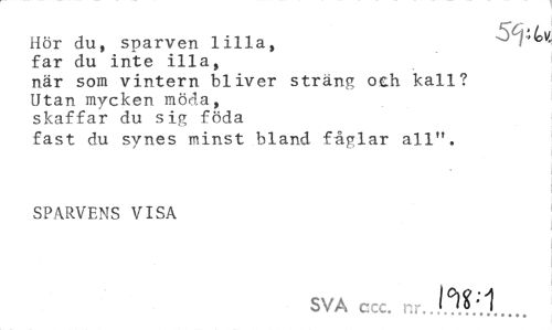 //// Hör du, sparven lilla, far du inte illa, //// när som vintern bliver sträng och kall? Utan mycken möda, skaffar du sig föda //// fast du synes minst bland fåglar all". SPARVENS VISA //// SVA ccc. nr. //// hn ////