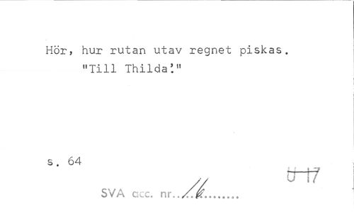 //// Hör, hur rutan utav regnet piskas. "Till Thilda!" //// s. 64 //// // 0-17 SVA ccc. nr,,/M... ////