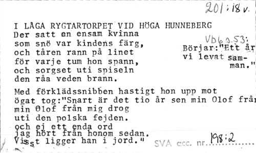 //// XOI ¦> I/. //// I LÅGA RYGTARTORPET VID HÖGA HUNNEBERG Der satt en ensam kvinna //// som snö var kindens färg, ar-"#t¥ L //// och tåren rann på linet 1"'' + //// för varje tum hon spann, 1 eyn t^lT » //// och sorgset uti spiseln m n* //// den råa veden brann. //// Med förklädssnibben hastigt hon upp mot //// ögat tog:"Snart är det tio år sen min Olof frå //// min Olof från mig drog //// uti den polska fejden. //// gch ej ett fnda ord //// pag hört fran honom sedan. kvr • T } Visjjt ligger han i jord." svA ccc< nr... //// »v ' ////