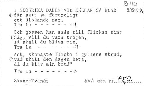 //// o n o //// I SKOGRIKA DALEN VID KÄLLAN SÅ KLAR <||: där satt sa förtroligt ett älskande par. Tra la --- //// Och gossen han sade till flickan sin: l\VSäg, vill du vara trogen, så skall du bliva min. Tra la --- -'-Ij- //// Ack, skönaste flicka i gyllene skrud, \||'.vad skall den dagen heta, då du blir min brud? //// Tra la--- //// Skåne-Tvanås SVA ccc. nr. JW... ////
