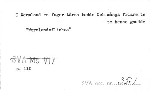 //// I Wennland en fager tärna bodde Och många friare te //// te henne gnodde //// "Wermlandsflickan" //// ^fP. Ms VIT //// s. 110 //// SVA ccc. nr. ////