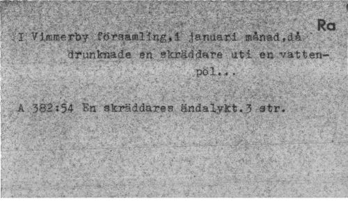 //// i - - - . ^ Ra //// .1 Vimffierby församling;, 1 januari m&nad, då //// drunknade en skräddare uti en vatten- //// ;. .*.. ' >'-ä .. •**.- .,-",>• » r' .V"':;.''' -.'...;¦ -". ... ¦ •• //// 4 \ - pöl. . //// . ^ .i * a.,fs. C. ¦¦. :v> ¦ : ¦ ' . sv -v-,i v-» //// ' ' ' • . • - - ' . ¦ • v - - * -.. ,:>- • •• ¦ • ¦ • ' , • //// . "* . ? ' - ¦ ¦ - .. i ;, ¦ ' * - , t , (* ? ' //// A 382:54 Bn skräddares ändalykt.3 str. //// ' • -V ,v i V- v- ' ¦ ¦'. ¦ //// v;'VÄ ¦' .. . . V ¦ '/ *". ..,' ////