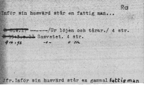 //// f ¦ Ra: //// Inför sin husvärd står en fattig man... //// Bi //// |v. S* ___ ' J //// ---/Ur löjen ooh tårar./ 4 str. //// P Samvetet. 4 str. //// K //// gjpfr.Infor sin husvärd står en gammal fattif ////