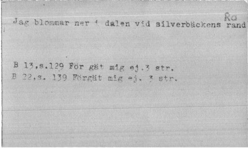 //// <-rag blommar ner 4 dalen vid silverbäckens rand //// i //// B 13,s.l29 För gs+ mig ejstr, //// B 22,3. 139 Förgät mig J str. ////