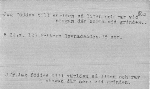 //// - -- - --T- - - "> //// K v //// Jää föddes t*1 1 värl den Mt»n nch nr v!du"" //// stugan där borta vid grinden.. //// B 22.s. 125 ?ett*»r« levnadsöden. 13 st~. //// Jft.Jag föddas till världen så liten och rar i sttigän dä" nere vid -rinden. ////