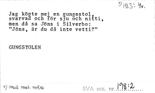 //// my. 1v. //// Jag köpte mej en gungestol, svarvad och för sju och nitti, men då sa Jöns i Silverbo: "Jöns, är du då inte vetti?" //// GUNGSTOLEN //// >9 ^vut vmX- vvt^tv SVA ccc. nr, ////