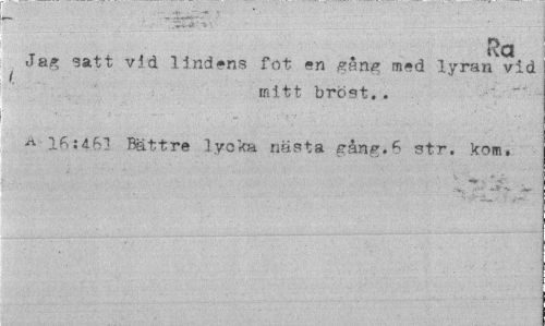 //// Ra //// Jag satt vid lindens fot en gång m*d lyran vid //// i //// mitt bröst.. 16:461 Bättre lycka nästa gång.6 str. kom. ////