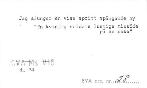 //// Jag sjunger en visa spritt spångande ny //// "En kvinlig soldats lustiga missöde //// på en resa" //// stfrm-tm //// d. 74 //// SVA ccc. ... ////
