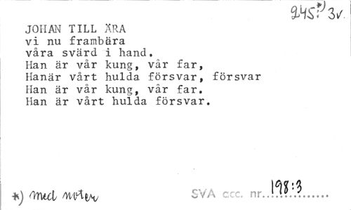 //// mv3/ //// JOHAN TILL ÄRA //// vi nu frambära //// våra svärd i hand. //// Han är vår kung, vår far, //// Hanär vårt hulda försvar, försvar //// Han är vår kung, vår far. //// Han är vårt hulda försvar. //// *) mel »Mrtt*/ SVA c nr..!?.?:.?... ////