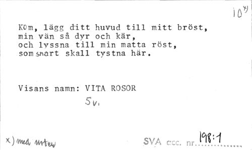 //// lO" //// KCm, lägg ditt huvud till mitt bröst, min vän så dyr och kär, och lyssna till min matta röst, som snart skall tystna här. //// Visans namn: VITA ROSOR //// 51/, //// *) <MH Mwv SVA ccc. nr.Mil.„„, ////