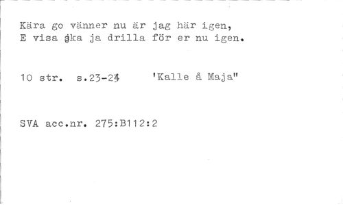 //// Kära go vänner nu är jag här igen, E visa §ka ja drilla för er nu igen. //// 10 str. s.23-2$ 'Kalle å Maja" //// SVA acc.nr. 275:B112:2 ////