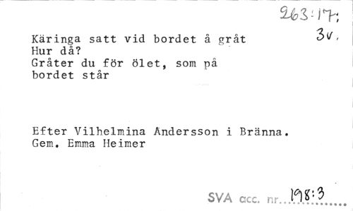 //// iéS-l?; //// Käringa satt vid bordet å gråt Hur då? //// Gråter du för ölet, som på bordet står //// Efter Vilhelmina Andersson i Bränna. Gem. Emma Heimer //// SVA ccc. nr. W.?,. ////