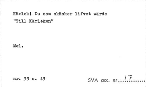 //// Kärlek! Du som skänker lifvet wärde "Till Kärleken" //// Mel. //// ! //// I nr. 39 s. 43 SVA acc. nr...J.J... ////