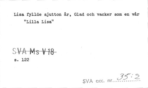 //// Lisa fyllde sjutton år, Glad och vacker som en vår "Lilla Lisa" //// S VA Ms V fö- //// s. 122 //// ?<<' ^ //// SVA ccc. nr...rf.-... ////