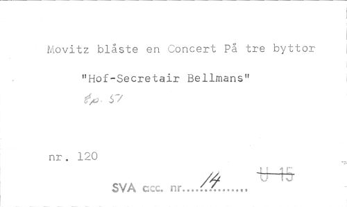 //// Movitz blåste en Concert På tre byttor //// "Hof-Secretair Bellmans" //// ^ 57 //// nr. 120 //// t ? A f //// /a irttr //// SVA ccc. nr.../... ////