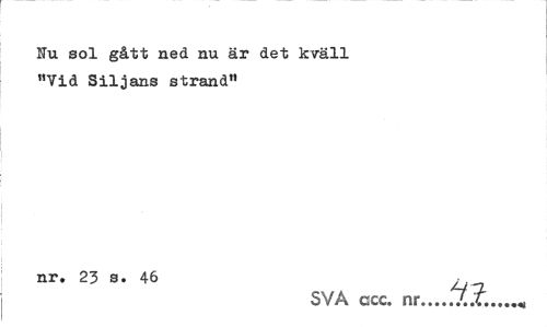 //// Nu sol gått ned nu är det kväll "Vid Siljans strand" //// nr. 23 s. 46 . //// SVA acc. nr...V..4...« ////