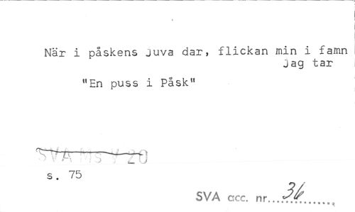 //// När i påskens Juva dar, flickan min i famn //// jag tar //// "En puss i Påsk" //// T--é~9f\ //// ' ' ¦> 4» yJ s. 75 //// SVA ccc. nr. //// ...i ////