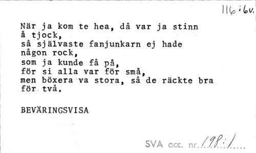 //// '(oV, //// När ja kom te hea, då var ja stinn å tjock, //// så självaste fanjunkarn ej hade //// någon rock, //// som ja kunde få på, //// för si alla var för små, //// men böxera va stora, så de räckte bra //// för två. //// BEVÄRINGSVISA //// SVA ccc. nr...9^.,..., ////