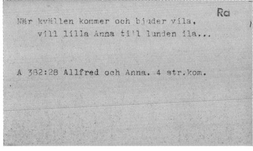 //// : Ra //// När kvällen kommer och b.i åder vila, j //// ! vill lilla Anna t i!1 landen ila... //// ; A 382:28 Allfred och Anna. 4 str.kom. //// ¦" ' ¦ ¦ ' < • : ////