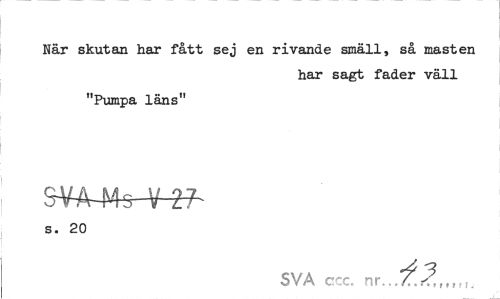 //// När skutan har fått sej en rivande smäll, så masten //// har sagt fader väll //// "Pumpa läns" //// s. 20 //// SVA ccc. nr... //// ti... ////