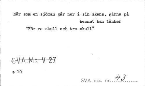 //// Här som en sjöman går ner i sin skans, gärna på //// hemmet han tänker "För ro skull och tro skull" //// SVA Ms V 27 //// s 10 //// SVA ccc. nr. ////