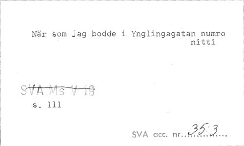 //// När som jag bodde i Ynglingagatan numro //// nitti //// o i H . o ¦¦/ t • j s. 111 //// SVA ccc. J?... ////