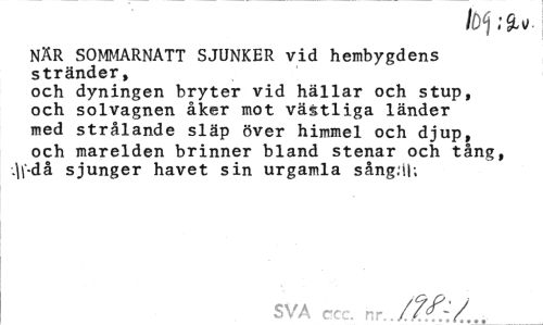 //// Ib1 //// NÄR SOMMARNATT SJUNKER vid hembygdens stränder, //// och dyningen bryter vid hällar och stup, och solvagnen åker mot västliga länder med strålande släp över himmel och djup, och marelden brinner bland stenar och tång, \-då sjunger havet sin urgamla sång.ll; //// SVA ccc. nr /.??.{/ ////