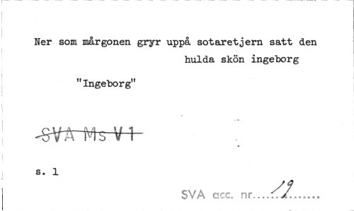 //// Ner som mårgonen gryr uppå sotaretjern satt den //// hulda skön ingeborg //// "Ingeborg" //// SiirM^Fh ' //// s. 1 //// SVA acc. ... ////