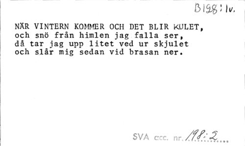 //// när vintern KOMMER OCH det blir kulet, och snö från himlen jag falla ser, då tar jag upp litet ved ur skjulet och slår mig sedan vid brasan ner. //// SVA //// ccc. nr ////