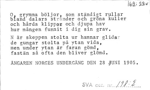 //// O, grymma böljor, som ständigt rullar bland dalars stränder och gröna kuller och hårda klippö» och djupa hav hur mången funnit i dig sin grav. //// N är skeppen stolta ur hamnar glidar de gungar stolta på ytan vida, men under ytan är faran gömd, fastän så ofta den bliver glömd. //// ÄNGAREN NORGES UNDERGÄNG DEN 28 JUNI 1905. //// SVA gcc. nr..///:.ff... ////
