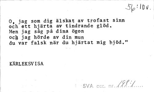 //// 11N. //// O, jag som dig älskat av tf-ofast sinn och ett hjärta av tindrande glöd. Men jag såg på dina ögon jag hörde av din mun du var falsk när du hjärtat mig bjöd." //// KÄRLEKSVISA //// t SVA ccc. nr. ////