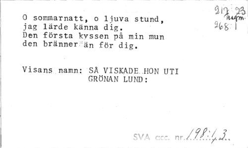 //// a o B //// O sommarnatt, o ljuva stund, //// jag lärde känna dig. ' & * //// Den första kvssen på min mun //// den bränner än för dig. //// Visans namn: SÄ VISKADE HON UTI GRÖNAN LUND: //// SVA c.c nr./.?,?. ////