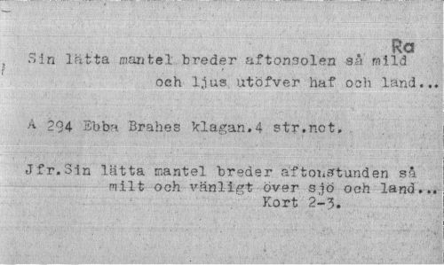 //// Ra //// Sin lätta mantel breder aftonsolen så mild //// och ljus utöfver haf ooli land... //// A 294 Ebba Brahes klagan.4 str.not. //// Jfr.Sin lätta mantel breder aftonstunden så //// milt och vänligt över sjö och land... //// Kort 2-3. ////