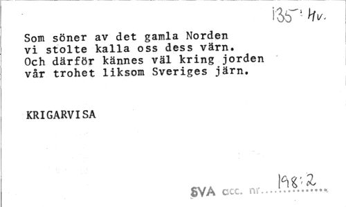 //// i&P Hv. //// Som söner av det gamla Norden vi stolte kalla oss dess värn. Och därför kännes väl kring jorden vår trohet liksom Sveriges järn. //// KRIGARVI SA //// te £< x //// SVA cec. nr...1..'. ////