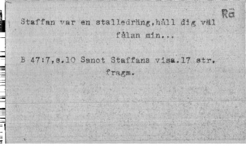//// i la //// ¦ Staffan var en.stalledräng,håll dig väl I fålan min.,. //// B 47:7,3.10 Sanct Staffans visa.17 str, 1 fragm. //// i * ////