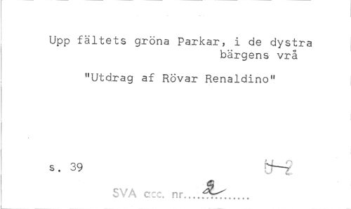 //// Upp fältets gröna Parkar, i de dystra //// bärgens vrå //// "Utdrag af Rövar Renaldino" //// s. 39 thr j SVA ccc. nr...4rT... ////