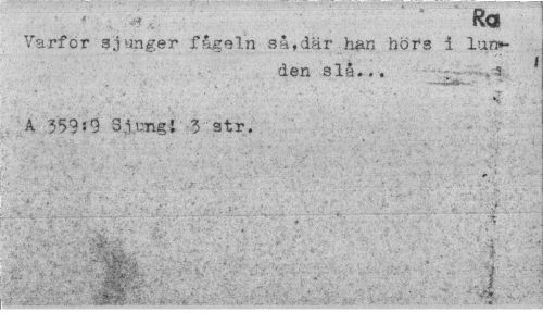//// Ka //// Varför sjunger fågeln så,där han hörs i lum- //// den slå... . -i 1 //// . -• - //// V //// A 359:9 3.i.ungi 3 str. //// ^ , ' ; * *' ' • - . .» " .* " ' , ' . ' ; .V" • ' ////