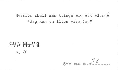 //// f //// Hvarför skall man tvinga mig att sjunga "Jag kan en liten visa jag" //// SW-Ms-V-S //// s, 38 //// SVA ccc. nr. ////