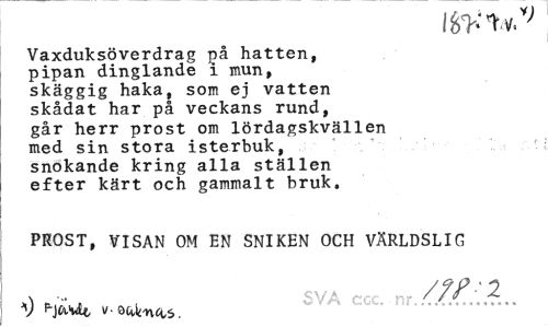 //// Vaxduksöverdrag på hatten, pipan dinglande i mun, skäggig haka, som ej vatten skådat har på veckans rund, går herr prost om lördagskvällen med sin stora isterbuk, snokande kring alla ställen efter kärt och gammalt bruk. //// PROST, VISAN OM EN SNIKEN OCH VÄRLDSLIG //// \ /fP 2 //// V P-jcivlt vocUm^s. ////