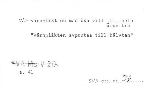 //// Vår värnplikt nu man öka vill till hela //// åren tre //// "Värnplikten avprutas till hälvten" //// ^^rA-M-s i/ 2'.> //// s. 41 //// SVA c:, nr...5^... ////