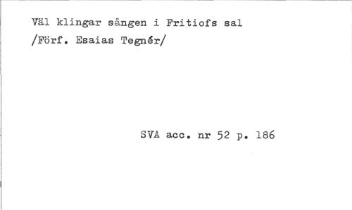 //// Väl klingar sången i Fritiofs sal /Förf. Esaias Tegnér/ //// SVA acc. nr 52 p. 186 ////